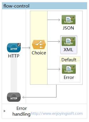 Mule ESB最基本的路由组件就是Choice组件,组件类似于我们在编程语言中的if/esle if/else。订单的格式是存放在Message Inbound Properties中的。这里就使用Choice组件来判断订单的格式。