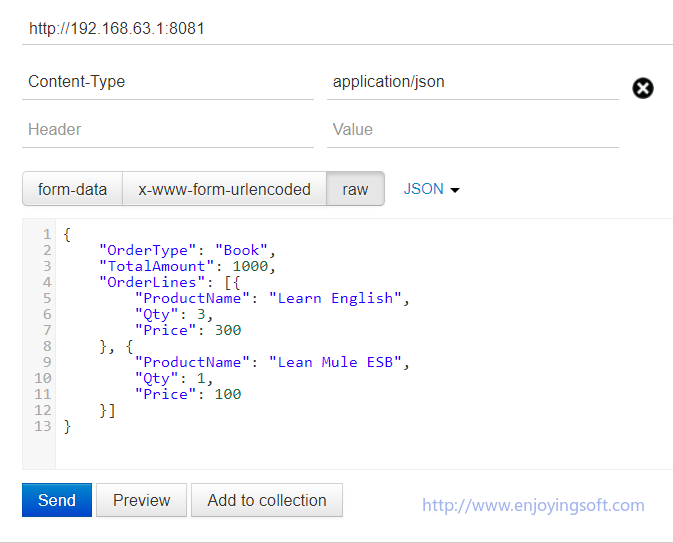 通过Postman的Preview可以看到,实际上Http的Request头信息上设定了Content-Type字段为application/json。